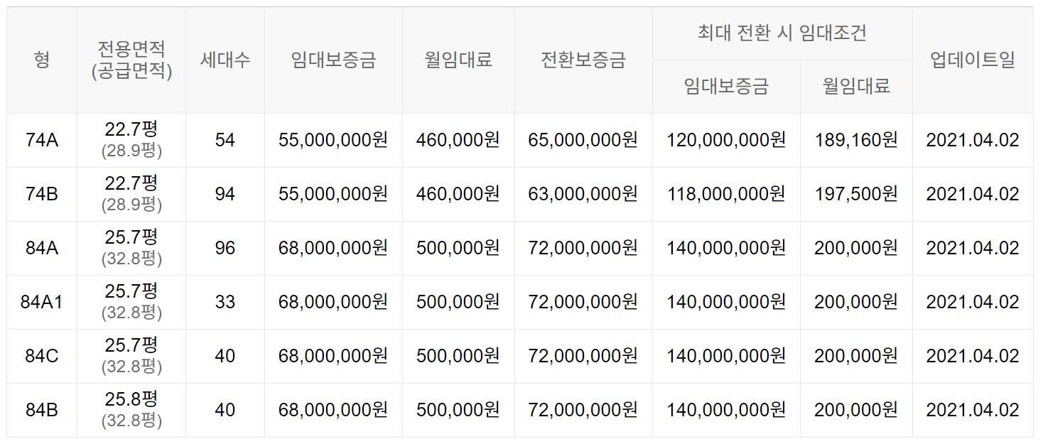임대보증금 및 월 임대료는 입주자 모집공고일 기준이며, 보증금 최대 전환 시 변동될 수 있습니다.
