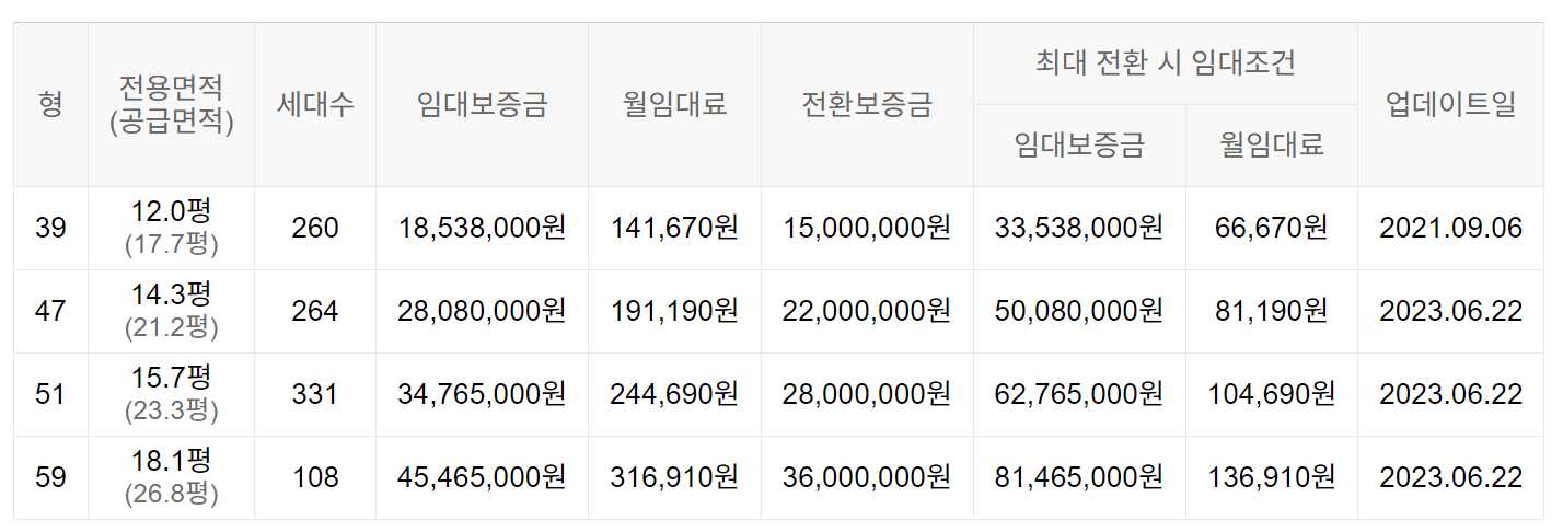 임대보증금 및 월 임대료는 입주자 모집공고일 기준이며, 보증금 최대 전환 시 변동될 수 있습니다.