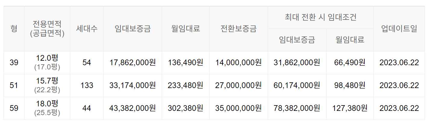 임대보증금 및 월 임대료는 입주자 모집공고일 기준이며, 보증금 최대 전환 시 변동될 수 있습니다.