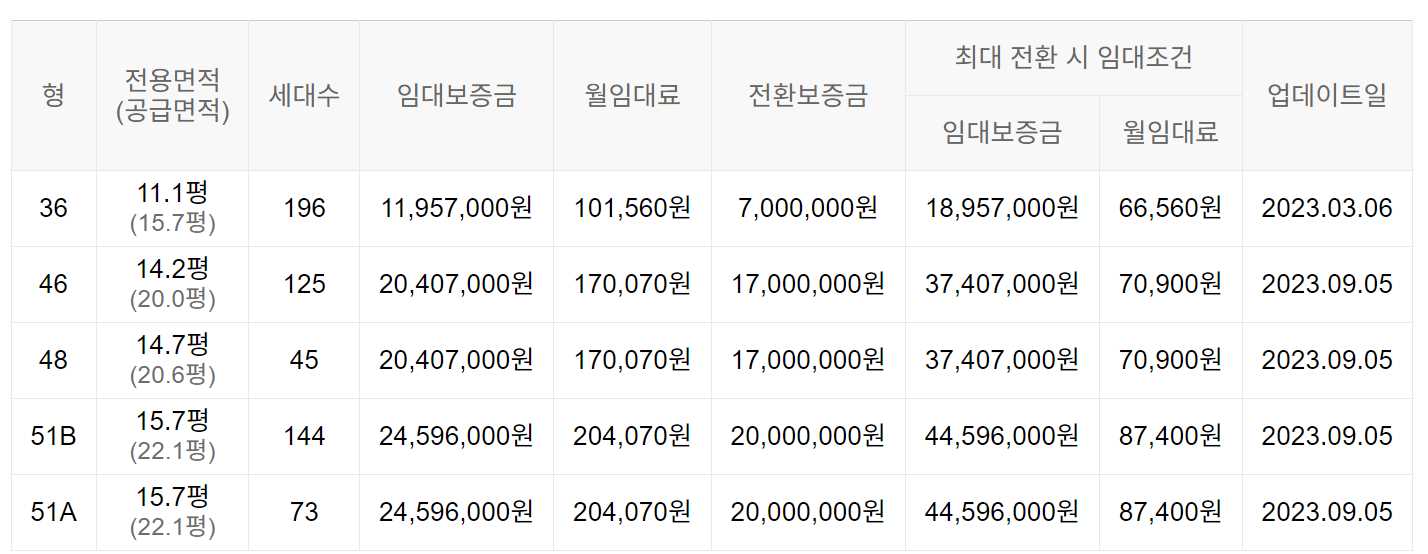 임대보증금 및 월 임대료는 입주자 모집공고일 기준이며, 보증금 최대 전환 시 변동될 수 있습니다.