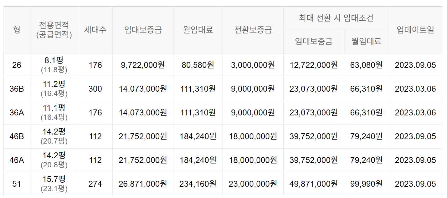 임대보증금 및 월 임대료는 입주자 모집공고일 기준이며, 보증금 최대 전환 시 변동될 수 있습니다.