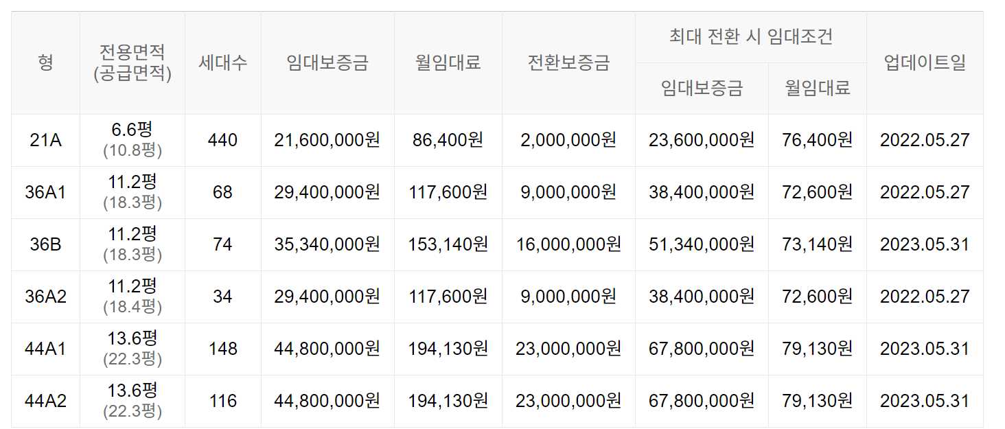 임대보증금 및 월 임대료는 입주자 모집공고일 기준으로 보증금 최대 전환 시 변동될 수 있습니다.