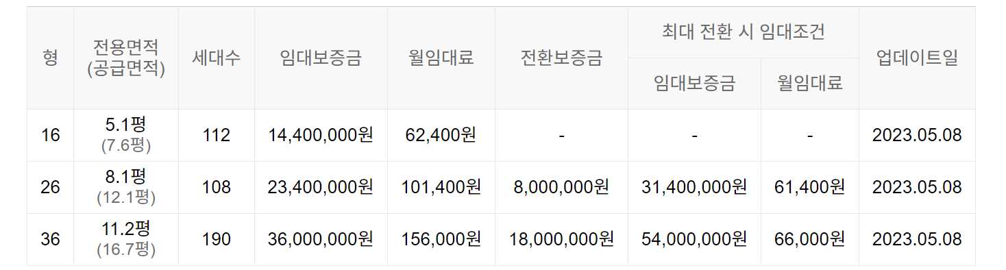 임대보증금 및 월 임대료는 입주자 모집공고일 기준으로 보증금 최대 전환 시 변동될 수 있습니다.