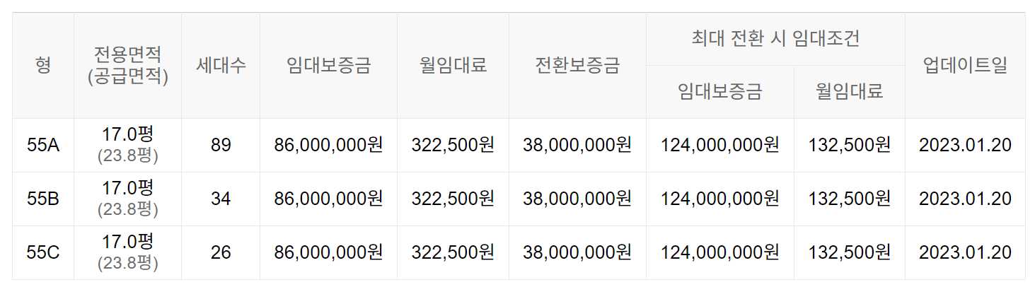 임대보증금 및 월 임대료는 입주자 모집공고일 기준으로 보증금 최대 전환 시 변동될 수 있습니다.