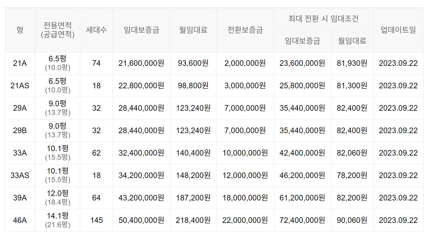 임대보증금 및 월 임대료는 입주자 모집공고일 기준으로 보증금 최대 전환 시 변동될 수 있습니다.